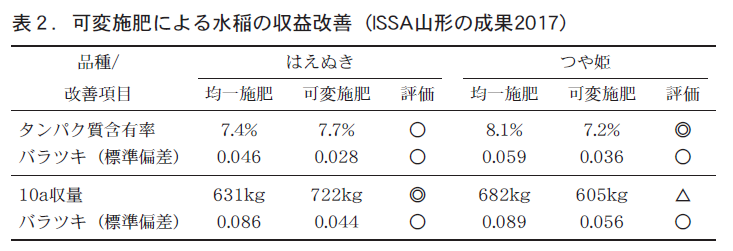人工衛星や航空機,ドローンなどに搭載したセンサーを用いて,上空から水稲葉の窒素含量を推定し,玄米のタンパク質含量を制御しようとする試みがなされている。水稲生産現場にリモートセンシングやGISによる空間情報技術を導入すれば,広域的に一筆ごとに植物体の窒素栄養状態が把握され,追肥を加減することによって,増収や良食味米の生産が可能になる。ISSA山形コンソーシアムではドローンによる近未来の稲作システムの開発を試み成果を上げている(表2) 。
