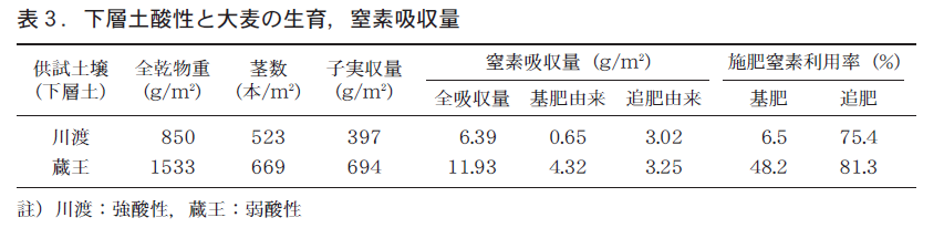 表3には下層土酸性の異なる土壌における大麦の生育と窒素吸収量の関係を示した。耐酸性の弱い大麦は強酸性下層土の川渡土壌では根張りが酸性矯正された作土に制限され,秋雨で下層土へ流亡した基肥窒素を殆ど利用できない(利用率6.5%) 。これに対して弱酸性の蔵王土壌では下層土深くまで根張りが行われ基肥窒素利用率は48.2%と高い,この基肥窒素の利用率を反映して全乾物重,子実収量は蔵王土壌に比べ強酸性の川渡土壌で著しく減収した。作土の根張り後行われる追肥窒素の利用率は両土壌で大きな差が無いことより,川渡土壌では基肥重点施肥より追肥重点施肥が有効である。また養分溶出が作物の生育に合せて行われる肥効調節型被覆肥料は降雨による成分の流亡が少なく,下層土強酸性土壌における耐酸性の弱い作物の栽培に特に有効である。