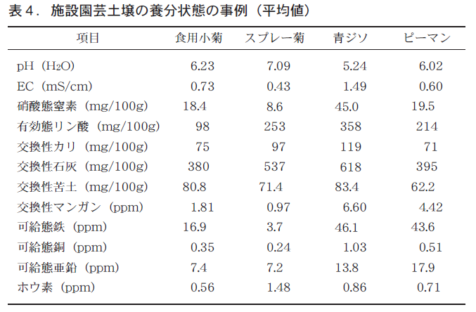 施設栽培では集約栽培がおこなわれ,また降雨が遮断され,養分の下層への溶脱が起こらず,作土層への顕著な養分集積がみられる。表4には愛知県東三河地域の施設園芸農家(食用小菊,スプレー菊,おおば(青ジソ) ,ピーマン)の跡地土壌分析結果の平均値を示した。ECはいずれの土壌も適正値(0.20〜0.40mS/cm)を超えており,硝酸態窒素(適正値2〜4mg/100g) ,有効態リン酸(同50〜80mg/100g) ,交換性カリ(同25〜45mg/100g) ,交換性石灰(同250〜450mg/100g) ,交換性苦土(同40〜60mg/100g)が多くの場合,適正値を超えて多量に蓄積している。これに対して,微量要素である交換性マンガン(適正値15〜35ppm) ,可給態鉄(同30〜150ppm) ,可給態銅(同1.3 〜3.0ppm) ,可給態亜鉛(同15〜40ppm) ,ホウ素(同0.7〜3.0ppm)は多くの場合,適正値を下回り潜在的欠乏症が懸念される。多量要素が集積しているのは降雨による流亡がないこと,微量要素の不足は集約栽培の施設園芸では土壌からの天然供給では不十分であることを示している。このことは高付加価値作物の高品質,多収栽培を行う施設園芸においては極めて深刻な状況であり,土壌診断に基づく多量要素の過剰集積には,灌漑水のかけ流しやクリーニングクロップの導入,微量要素の不足は肥料として補充する必要がある。