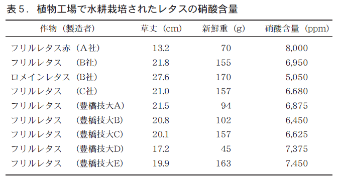 土壌の代わりにピートモスやロックウール,ココバックなどの養液栽培や水だけの水耕栽培が注目されている。水耕栽培では土壌を用いないので,培地への養分吸着が無く,養分の天然供給もないので養液組成の管理が重要である。水耕栽培はSaches (1860) とKnop (1962) によってはじめられ,その後,Hoagland and Arnon (1950)によって基本培地が完成しHoagland水耕液(me/l)として現在でも広く使用されている。窒素は16(硝酸態窒素が15,アンモニア態窒素が1) ,リンが3,カリが5,カルシウムが10,マグネシウムが4である。日本の代表的培養液である園試処方あるいは大塚A処方の組成を見ると,窒素は17.4〜18.2(硝酸態窒素が16〜16.6,アンモニア態窒素が1.4〜1.6) ,リンが4〜5.1,カリが8〜8.6,カルシウムが8〜8.2,マグネシウムが8〜3.0であり,ほぼHoagland水耕液を踏襲している。その特徴としては窒素量が極めて多くかつ硝酸態が主体であること,リン酸が少なく,カルシウムが多いことである。またこの他に微量要素類を肥料として,更には多くの場合炭酸ガスを施用することである。水耕栽培では植物体は土壌の関与なしに直接,養液から養分を吸収するので先に述べた植物体茎葉部の養分含量を考慮した養分供給が重要である。それ故,土壌吸着でリンの肥効が極端に低下する土地利用型農業に比べてリン施肥の重要性が薄れ,それよりも植物体の必要量が多いカルシウムや集約栽培ゆえに光合成に不足する炭酸ガスの供給が重要である。また窒素は植物の生育を大きく左右し重要であるが,主体が硝酸態で大量に施用されることが新たな問題を引き起こしている。硝酸態窒素は毒性が少なく,マイナスの効果が殆ど見られないので大量施用が可能である。これに対してアンモニア態窒素は代謝上有利に働くが,過剰の場合植物体に毒性を示すので,全窒素の1割弱に過ぎない。その結果,必要以上の窒素が供給され,硝酸態窒素として蓄積している。表5は愛知県内の植物工場で水耕栽培されたレタスの硝酸含量を示したもので5,050〜8,000ppm(平均6,828ppm)と極めて高い値である。我国では植物体の硝酸含量の規制は無いが,ヨーロッパでは人体内で亜硝酸に代わる恐れがあるとの懸念からレタスでは冬期5,000ppm,夏期4,000ppm以下と規制されており,近年我国消費者も高い関心を示している。この対策としては全窒素量を削減し,更にアンモニア態窒素の比率を高めることが有効である。筆者らは園試処方の窒素量を1/5に減量し,硝酸とアンモニアの比率を1対1にすることで,植物体収量を減ずることなく,植物体硝酸含量を1,375ppmと著しく低減することができた。