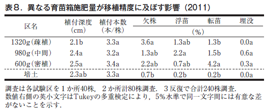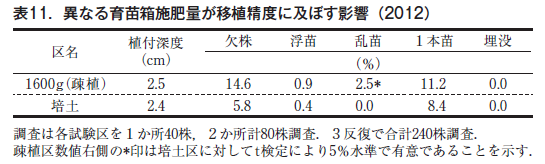 移植精度の調査結果では,植付深度は1600g区が2.5cmで培土区の2.4cmとほぼ同等であった。欠株率は培土区で5.8%,1600g区が14.6%と高かったが,有意な差ではなかった。概して2012年は前年より移植精度の低下が大きくなる傾向にあった。