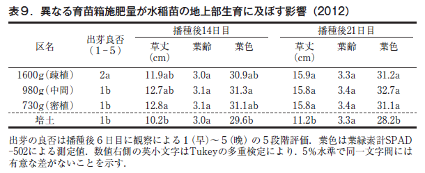 2012年は4月24日に播種を行った。前年の50%減肥では収量が減少気味であったことから,本田投入N量0.8kg/aの40%減として箱当たり施肥量を算出し,施肥量を1600,980,730g/箱の3水準とした(表3)。5月17日に移植し,翌日に移植精度を調べた。