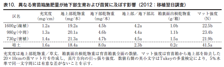 2012年は減肥率を40%へ変更したため,施肥量が増加した1600g区で出芽,初期生育が他の箱全量区よりやや遅れたが,育苗終了時には980g区や730g区と遜色ない生育を示した。マット強度は22~23Nにとどまった(表10)。このため,マットの取り出しを苗取り板で丁寧に扱う必要はあったが,前出のマット強度基準である20N以上であり,実用面で問題はなかった。