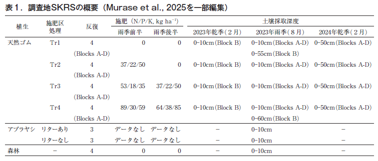 本研究は,タイ南部プラチュアップキリカン県のカセサート大学附属Sithiporn Kridakorn Research Station(SKRS)と中部チャチューンサオ県のChachoengsao Rubber Research Center(CRRC)の 2 つのゴム農園を対象に,施肥管理と土地利用の違いが土壌メタン酸化に与える影響を比較した。SKRSでは無施肥(Tr1)~高施肥(Tr4)までの4段階の施肥区が4つの反復ブロック(Block A~D)に無作為配置されており(表1),近接する森林およびアブラヤシ農園(施肥管理のデータなし)も比較対象として調査した。両サイトは熱帯モンスーン気候に属するが,土壌特性は異なり,SKRSは砂質で保水性が低く,CRRCは粘土質である。