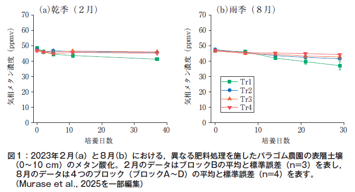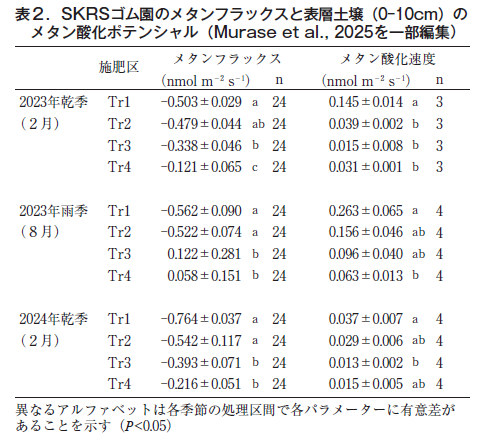 現地のメタンフラックスは乾季に大気メタンの吸収を示す負の値を記録したが,施肥量の多いTr3,Tr4では吸収が抑制された。雨季にはTr3,Tr4で土壌から大気へのメタン放出を示す正の値が観察され,土壌におけるメタンの生成が酸化を上回る状況が生じたと推察された(表2)。