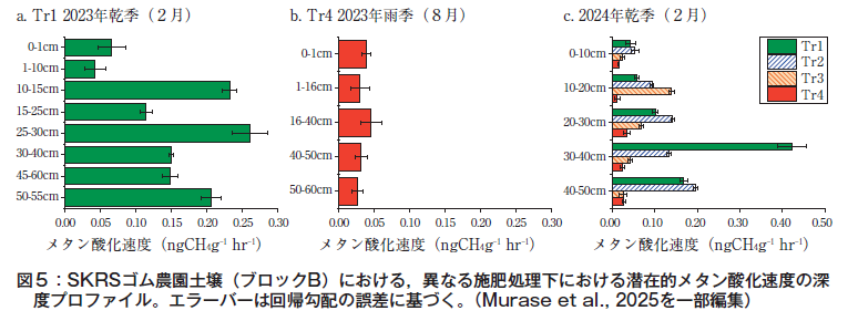 上記の結果を受けて,次に深層土壌がメタン酸化に寄与する可能性を検証した。乾季(2024年2月)に採取した深層(>10cm)土壌では,Tr1で表層よりもはるかに高いメタン酸化が観察された(図4)。Tr2でも同様の傾向が見られ,深層がメタン酸化に大きく寄与する可能性が示された。一方,Tr3,Tr4では深層のメタン酸化活性は低く,施肥量が増えるほど深層土壌のメタン酸化も抑制されるという明確な傾向が確認された(図5)。