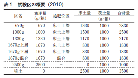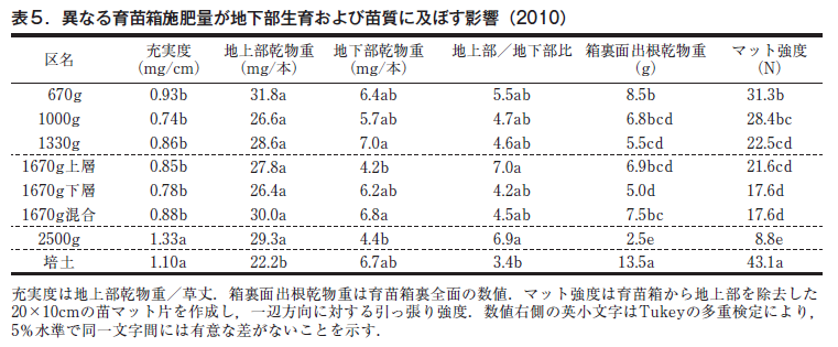 その結果,2010年に20N以上を確保できたのは培土区と670g区,1000g区,1330g区と1670g上層区であった(表5)。これに苗の出芽,生育状況等を勘案して,1330gまでの施肥量であれば移植に十分供用可能であると評価した。