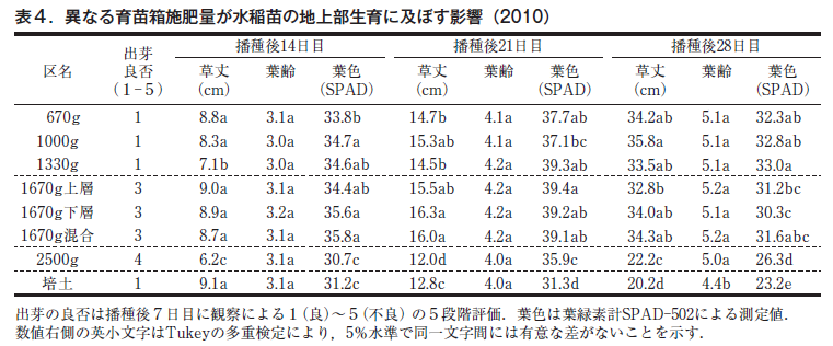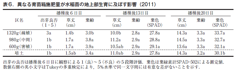 出芽の良否は1320g区で3となり,他区よりも揃いが遅れた。播種後20日目では,草丈は980g区の14.5cmが最高,600g区が13.6cmで最低であった。葉齢は3.2~3.3と箱全量各区間で有意な差はなかった。また葉色にも有意差はなかった。